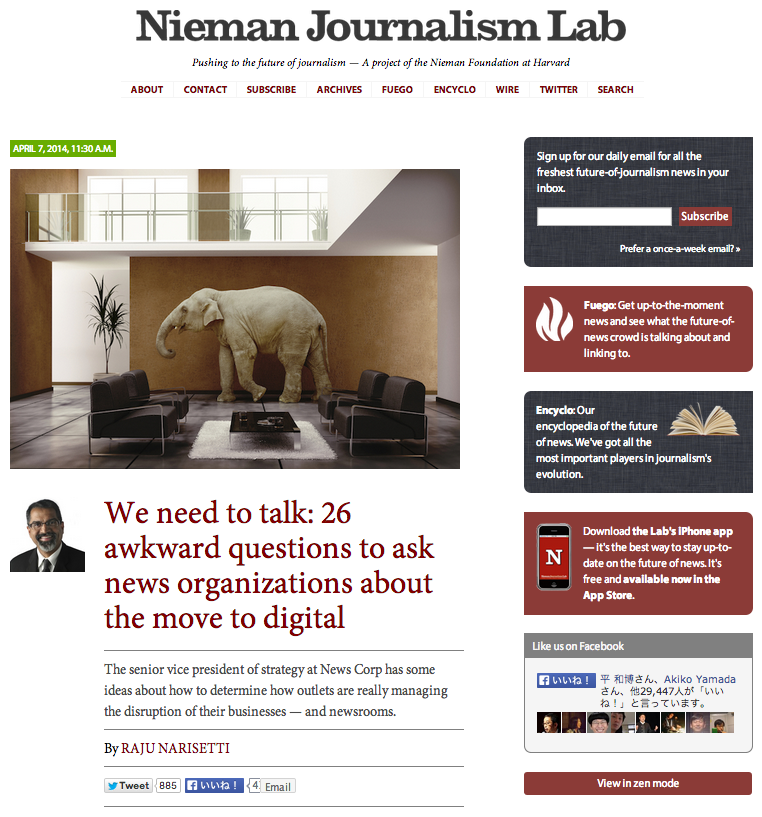 指標を提言するのは Raju Narisetti 氏による「We need to talk: 26 awkward questions to ask news organizations about the move to digital(ニュースメディアのデジタルへの移行を確認する“26の嫌な問い”)」です。