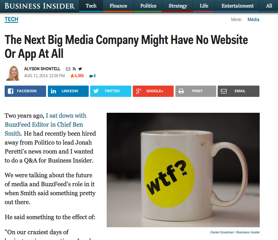 Shontell 氏は、つい最近、“バイラル系”メディアの代表格 BuzzFeed が 850 億円もの時価総額で、50億円の資金調達を実施したとの報道に触れて、2年前に当時 BuzzFeed 編集長として着任したばかりの Ben Smith 氏にインタビューしたことを想い出します。