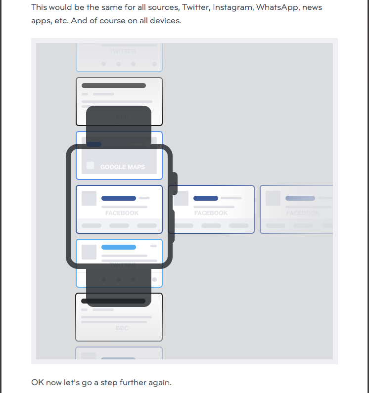 Adams 氏がヒントとして扱うのが、Android 5.0(Lollipop)の通知機能です。同機能はこれまでの情報のタイトル表示から、それぞれのコンテンツをカード(短冊のような形式)化し、そのカードの束としてユーザーに提供します。同氏はこのカード化したフォーマットがスマートフォンからウェアラブルにまで拡張可能な形式として、デザインアーキテクチャを構想しているのです。