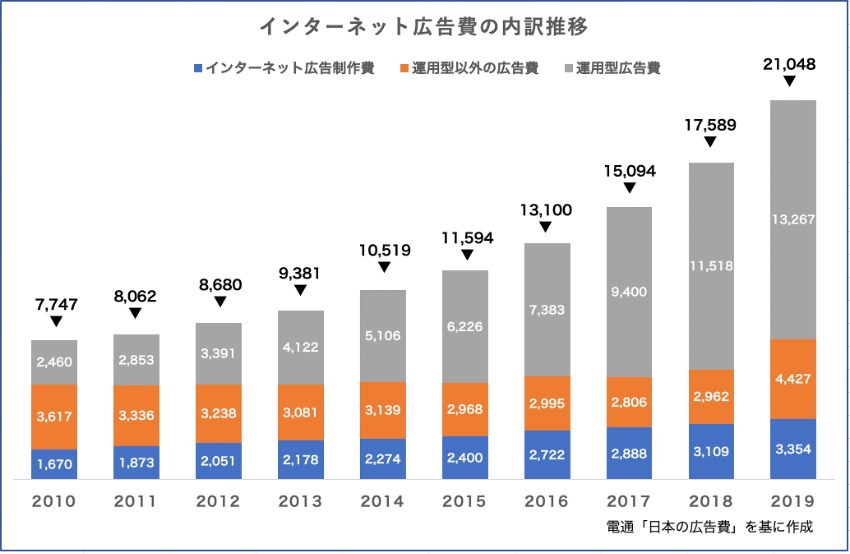 図2は、国内のインターネット関連広告費の推移だ。年々成長を見せ、2019年は2兆円を突破した。だが、その多くが「運用型広告」に占められているのが見て取れるだろう。これこそがITプラットフォーマへと広告費の多くが流れ込んでいる証だ。